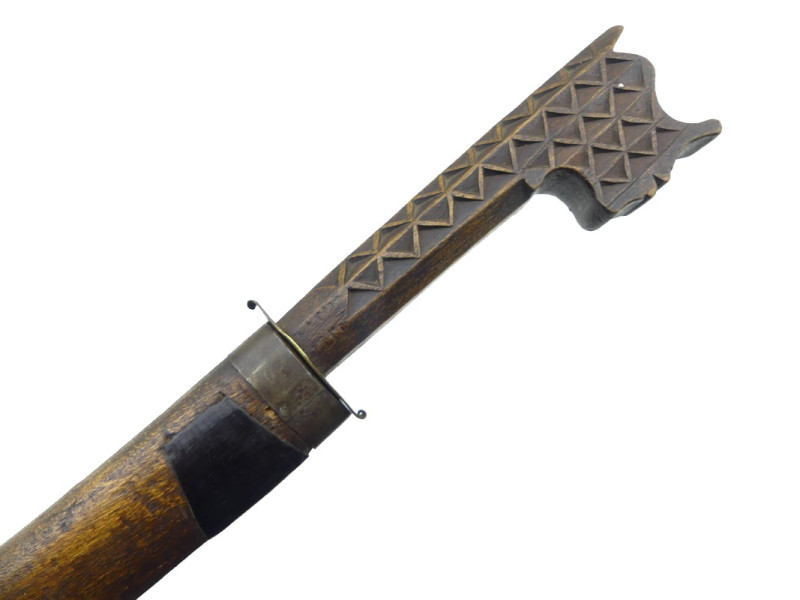 Joli fourreau en bois avec décor en suite et à motifs de croix sur un côté, deux bracelets fer.