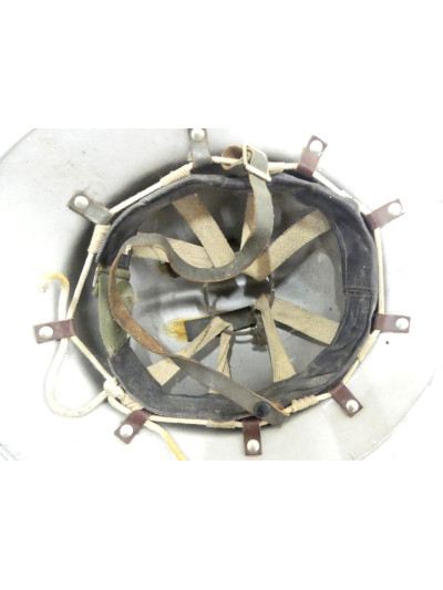 Intérieur de coiffure en cuir fauve et toile beige, proche du casque militaire français modèle 1951, avec jugulaire en cuir fauve.