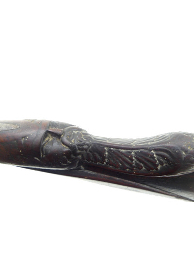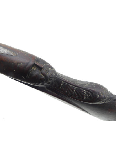 Le dessous est sculptée d’une tête d’un personnage barbu qui se prolonge par une tête animale dans le bas.