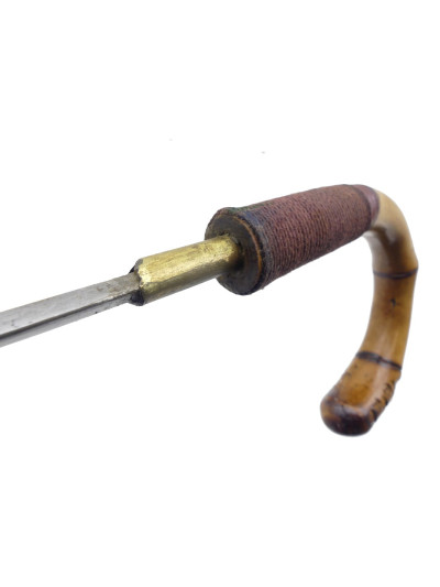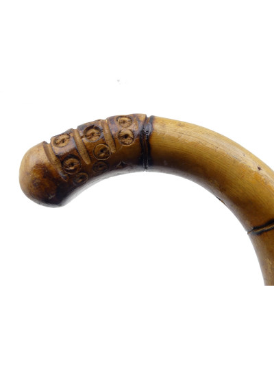 Poignée recourbée avec extrémité et pommeau avec décor de larges cannelures ornées d’une frise à motifs circulaires.