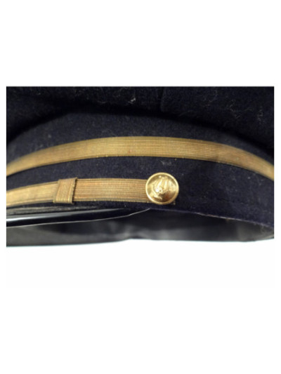 Coiffe et bandeau en drap bleu, dans une petite patine avec quelques traces d'usure par endroit.