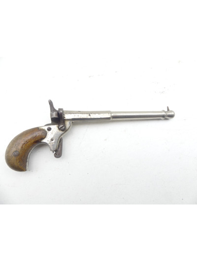 Pistolet de cycliste, également appelé "pistolet à moineaux" ou même "VeloDog", ou encore "pistolet de facteur", calibre 6mm bosquette, canon lisse, fabriqué à des milliers d'exemplaires en France vers 1895-1900 et exporté dans toute l'Europe. La plupart ont été fabriqués en France ou en Belgique, vendus "en blanc" en Allemagne, et éprouvés à Brême. Le U surmonté de deux couronnes est le poinçon officiel de Brême et signifie "untersucht" (éprouvé). Ce type de pistolet était offert en prime à tout acheteur d'un vélo. De nombreuses variantes ont été produites et il constitue un thème de collection à lui tout seul.