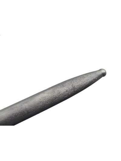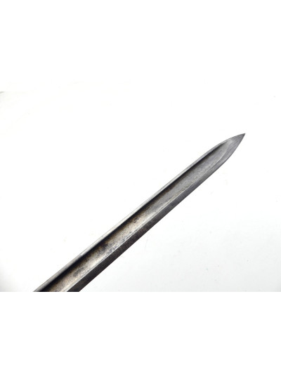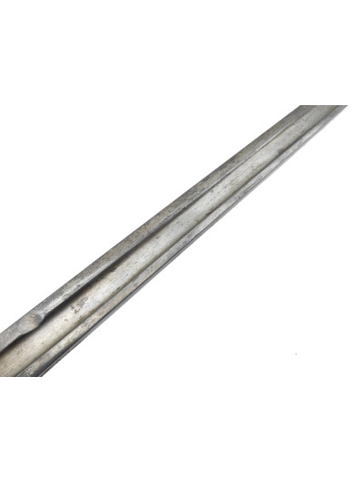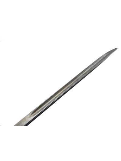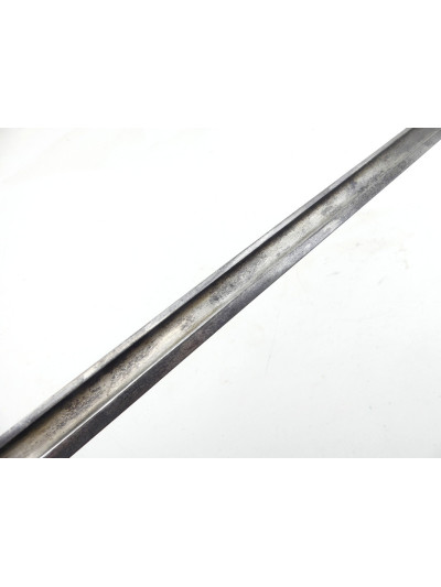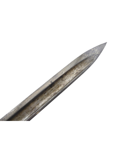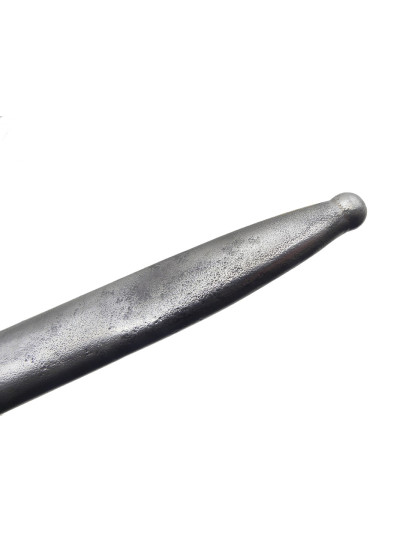 La lame droite de 40 cm polie est dans une petite patine grise, avec quelques taches d’oxydation de surface.