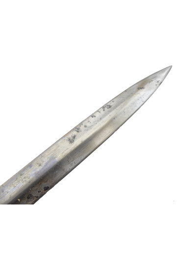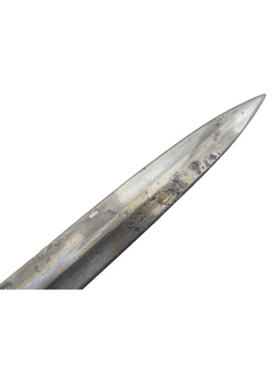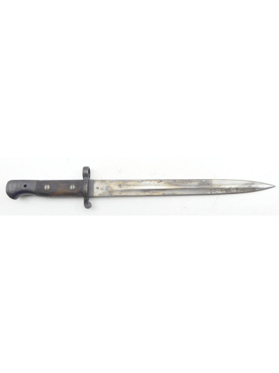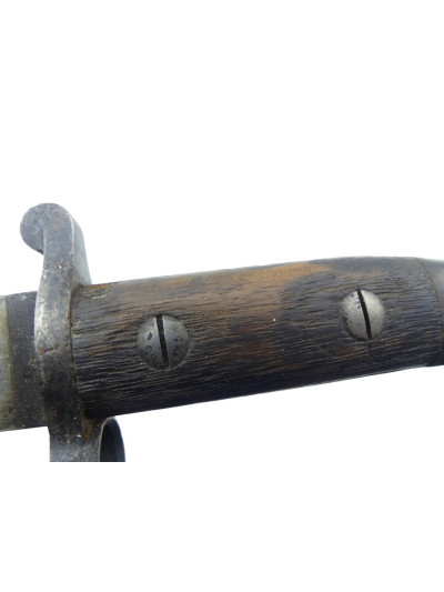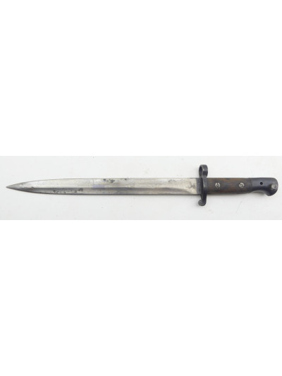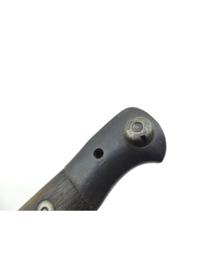 Bonnes plaquettes en bois maintenus par deux vis. Lame droite de 305mm avec deux tranchants et arête médiane.