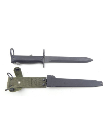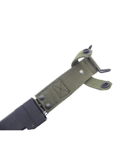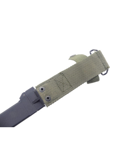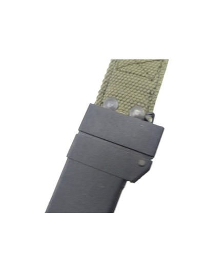 Porte-fourreau en toile kaki maintenu par deux rivets, crochet de ceinturon type US et fermeture à pression.