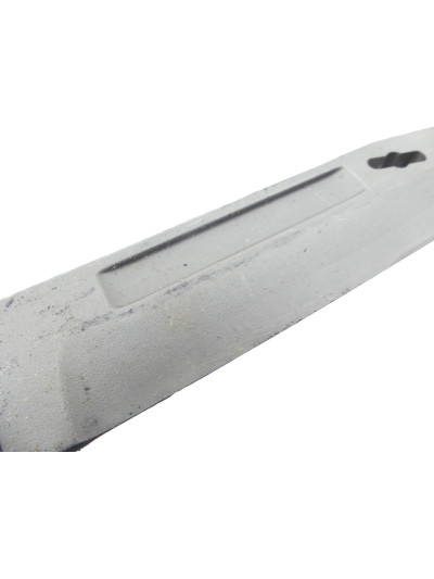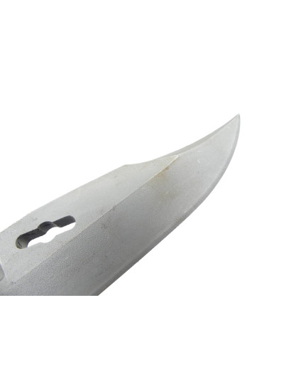 Lame de 18 cm de type bowie, décentrée à droite par rapport à la poignée.
