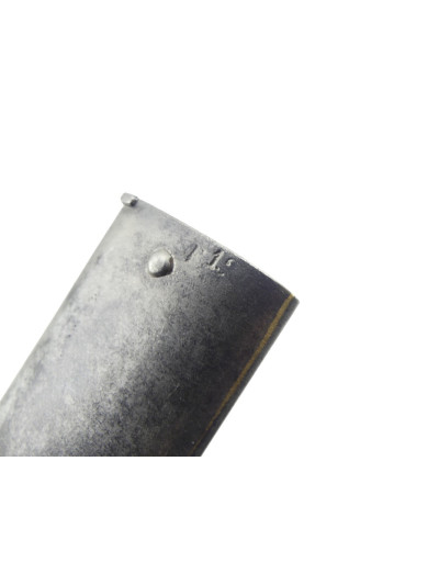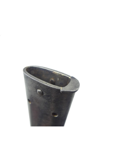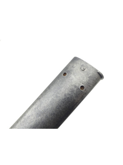 Fourreau en tôle d’acier dans une patine grise avec quelques taches d’oxydation par endroit.