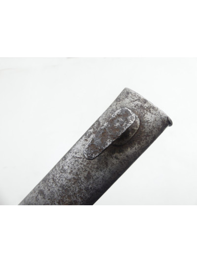 Fourreau en tôle d’acier avec taches d’oxydation plus ou moins prononcée et fortes piqûres par endroit.