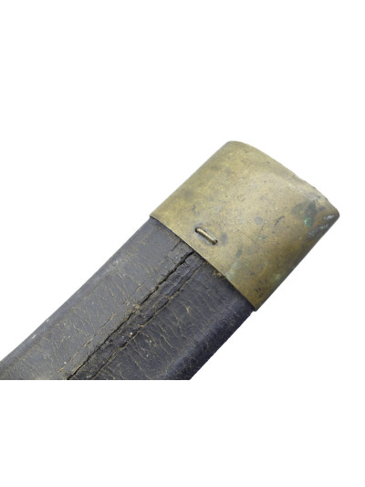 Fourreau en cuir noir patiné avec surface ternie, quelques traces d’usure de surface par endroit.