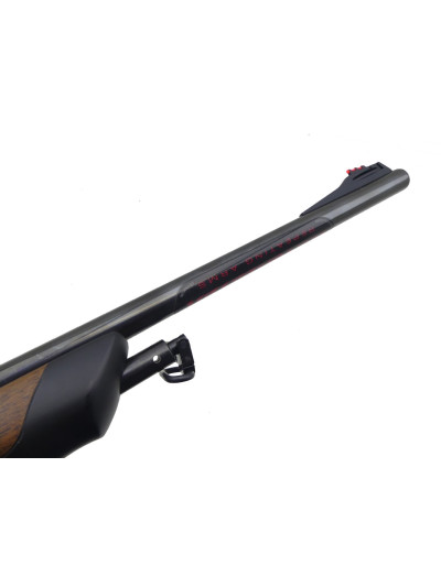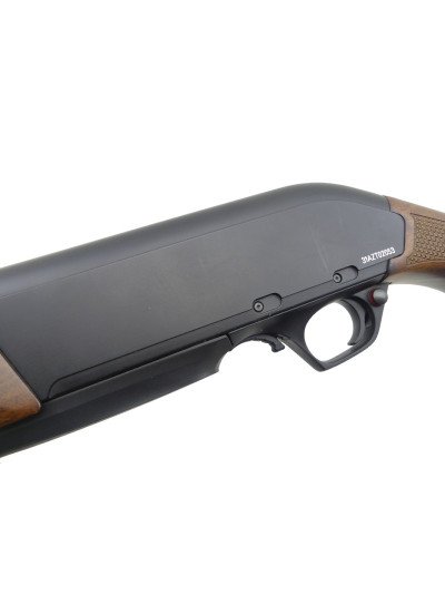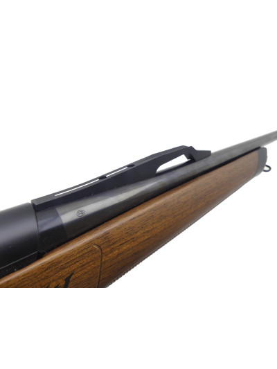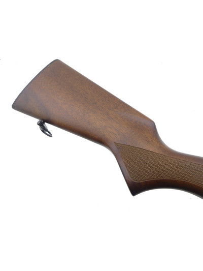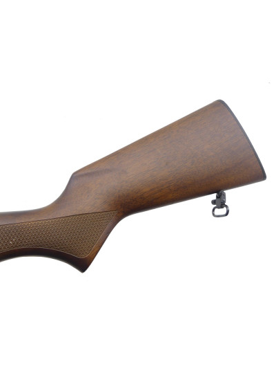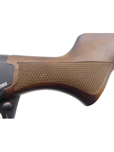 Beaux bois avec poignée pistolet et devant quadrillés, devant terminé par une partie en matière synthétique noire.