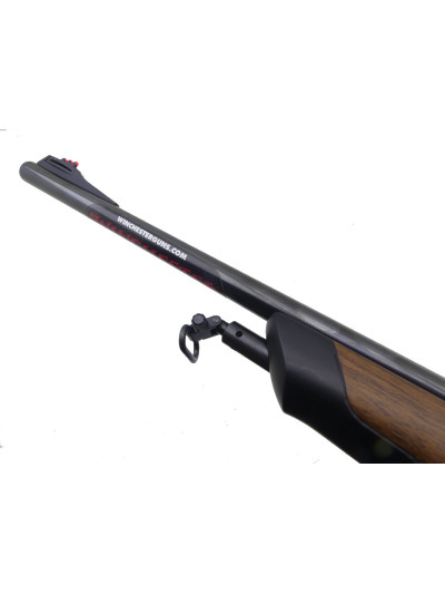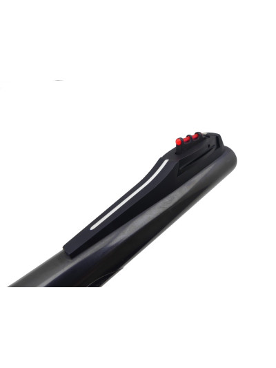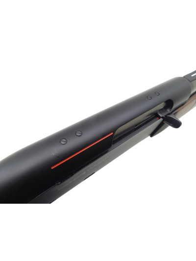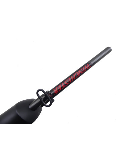 Canon de 55 cm avec bande de battue sur le dessus et guidon en plastique rouge sur rampe, avec encore l’étiquette Winchester.