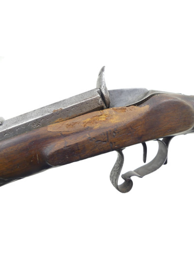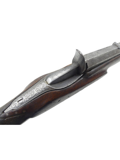 Le canon octogonal de 53,5 cm comporte un décor à motif de rinceaux et de frise à motif ondulé encore visible sur le premier tiers..