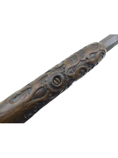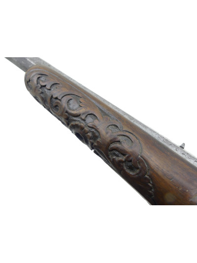 Bois mi-fût dans une petite patine, poignée quadrillée, devant du fût avec décor floral sculpté.