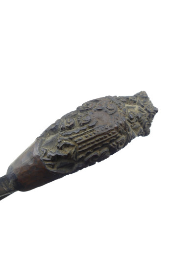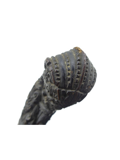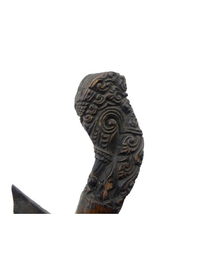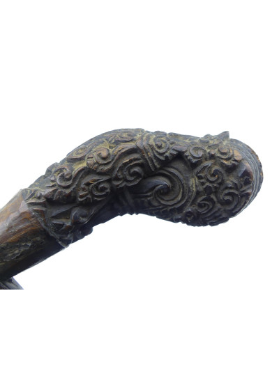 Poignée en bois avec riche décor floral sculpté, pommeau avec décor cannelé.