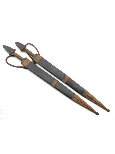 Joli fourreau en bois avec décor en suite et à motifs de croix sur un côté, deux bracelets fer.