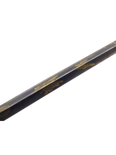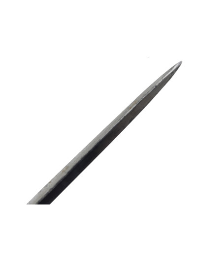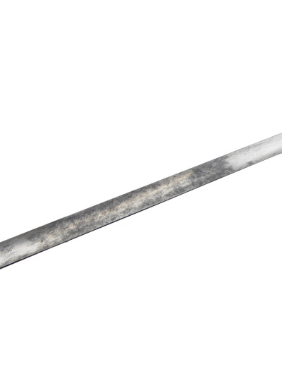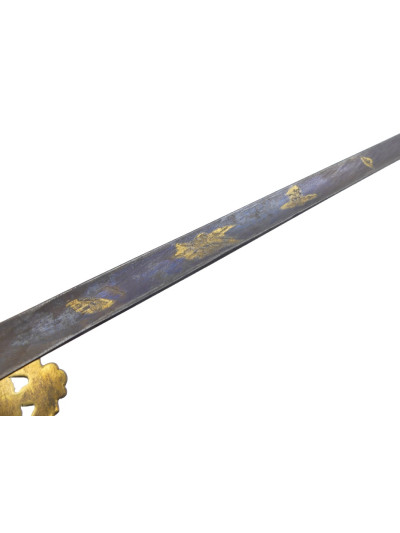 Lame triangulaire de 78 cm avec décor bleu et or encore présent sur la première moitié.