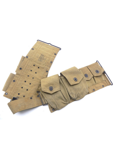 Deux ensembles de quatre cartouchières, deux pour chargeurs du fusil-mitrailleur Bar et deux pour clips de fusil Springfield 1903, reliés par un sanglon de toile.