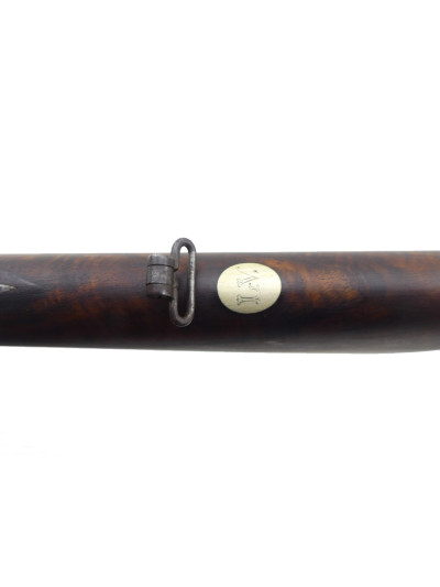 Bons bois dans une jolie patine, crosse à l’anglaise, pièce circulaire en maillechort marquée des initiales L.V.