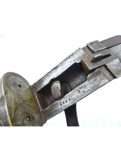 La bascule et les platines sont dans une patine grise avec taches d’oxydation par endroit.