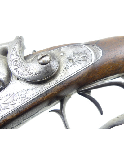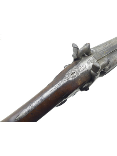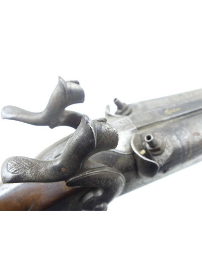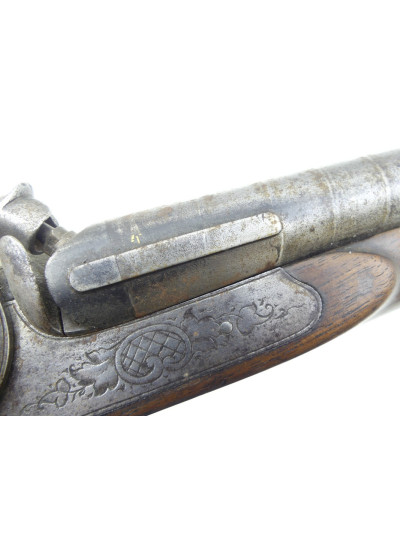 Bois dans une jolie patine avec quelques griffures par endroit, petite trace de choc sur le côté droit de la crosse anglaise, montage des canons à tiroir.
