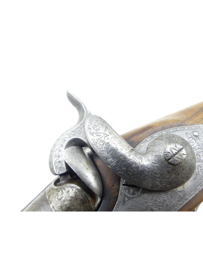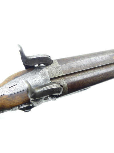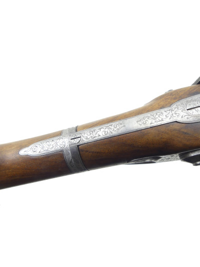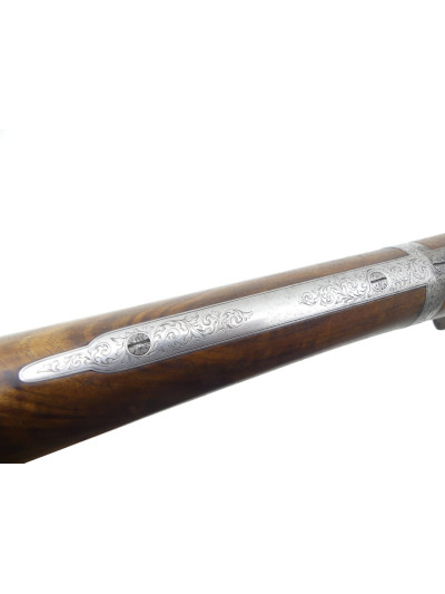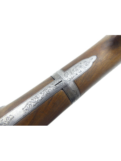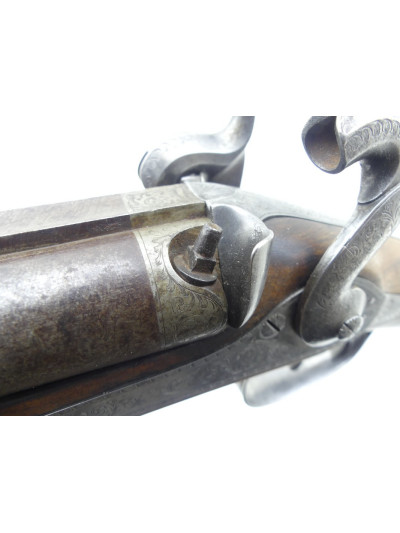 Platines avant à percussion avec fin décor gravé à motifs de rinceaux et frise sur les contours.