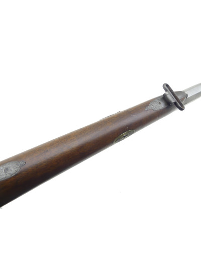 Bonnes garnitures fer poli dans une patine foncée, décor en suite sur le pontet, la sous-garde et le retour de plaque de couche.