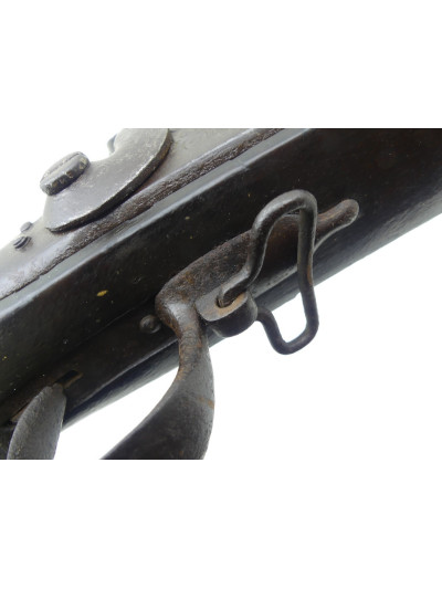 Garnitures fer dans une patine homogène, extrémité de sous-garde en goutte, capucine avec son épinglette, plaque de couche.