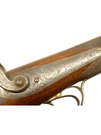Belle monture en loupe de noyer avec crosse anglaise, excellent quadrillage à la poignée avec pièce de pouce argent. Jolies garnitures fer avec entrée de baguette et devant de sous-garde en urne fleurie à décor de rinceaux.
