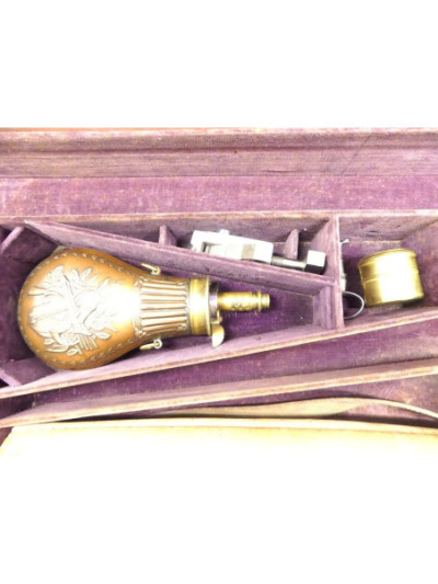 Contient les accessoires suivants : une baguette de nettoyage en bois à quatre éléments, un démonte-ressort, une boîte à capsule en laiton avec couvercle marqué N.L & T. Robert brevetés sur un décor rocaille, une poire à poudre en cuivre à décor de trophée de chasse et bec doseur en laiton marquée P.D.F.A. Paris, une banderole en cuir avec deux compartiments pour les plombs à doseurs en laiton marqués Patent, des écouvillons.