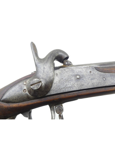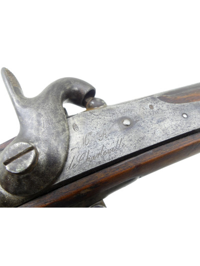 Elle est marquée de la Manufacture Royale de Charleville et poinçonnée de Louis Squiret, contrôleur des platines à Charleville de 1823 à 1830.