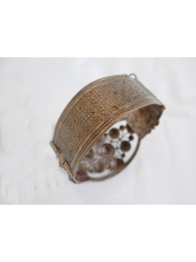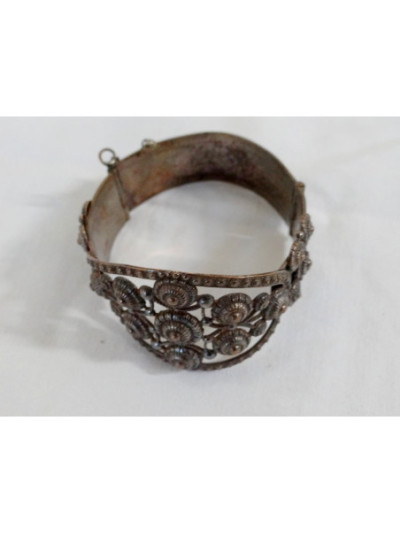 L’anneau du bracelet comporte une partie arrière sur charnière composées d’une bande pleine à décor de frise florale centrale avec contours cordés.