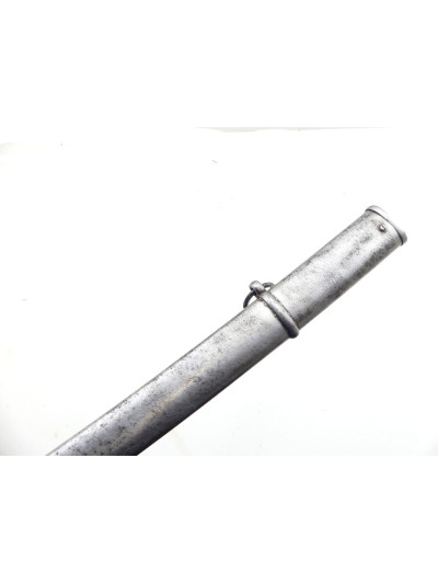 Le fourreau en tôle d'acier polie est dans une petite patine grise avec quelques taches d'oxydation par endroit, trace de choc dans le bas.